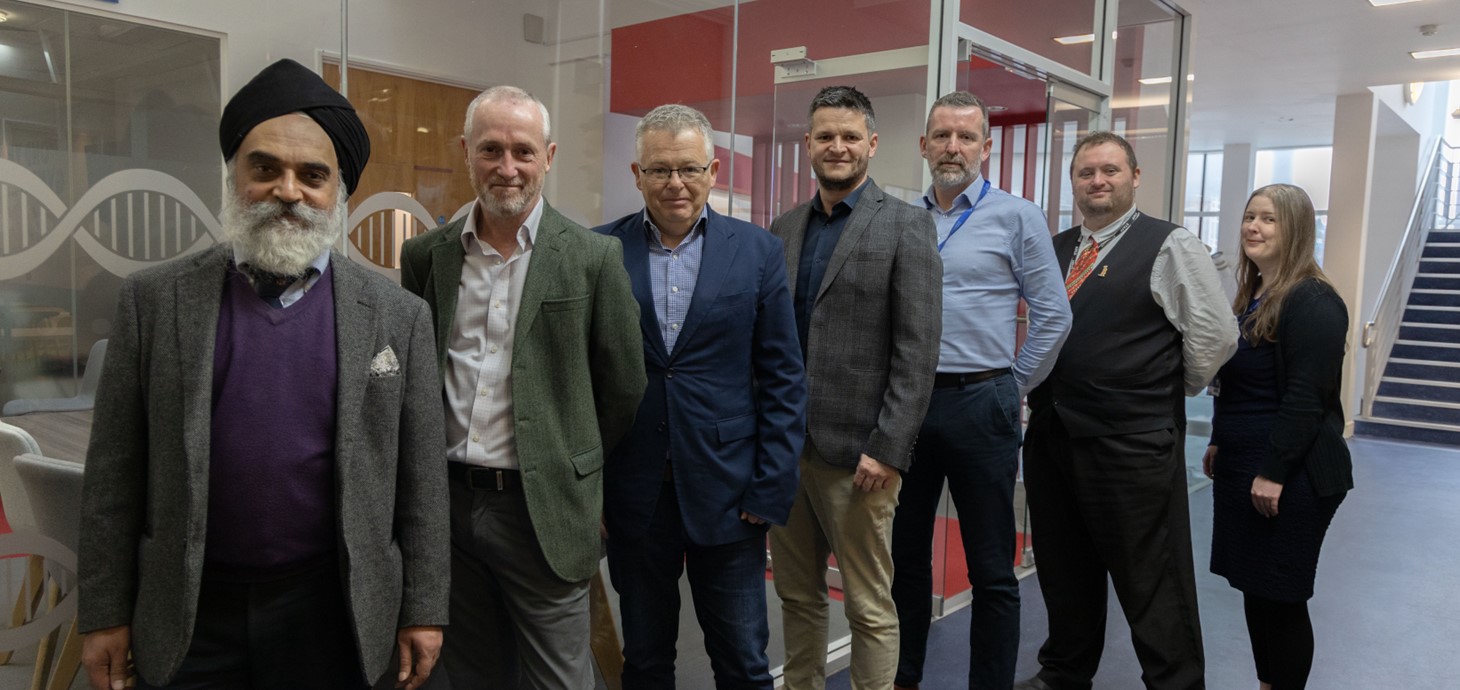 (From left) Dr Balwinder Bajaj, Mark Davies and Paul Jackson, from The Hospital Saturday Fund, Stuart Swan, Senior Development Manager at Swansea University, Professor Kenneth Mckeegan, Programme Director for Graduate Entry Medicine, Tim Hunt, Employability and Placements Assistant and Kathy Chamberlain, Senior Development Officer, Swansea University.