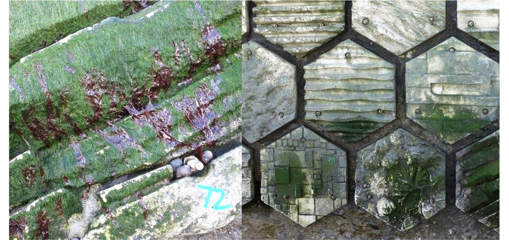 Colonisation by marine species of some of the concrete panels used in the research: (left) green algae, purple laver seaweed, periwinkles, and (right) green algae