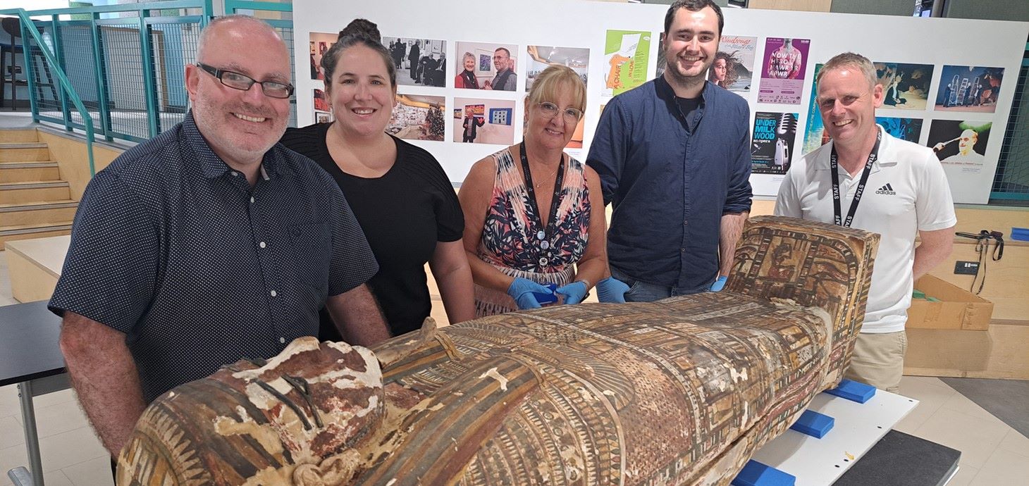 (From left) Museum curator Dr Ken Griffin, collections access manager Dr Meg Gundlach, museum manager Wendy Goodridge, PhD researcher John Rogers and learning and engagement co-ordinator Phil Hobbs with the coffin.