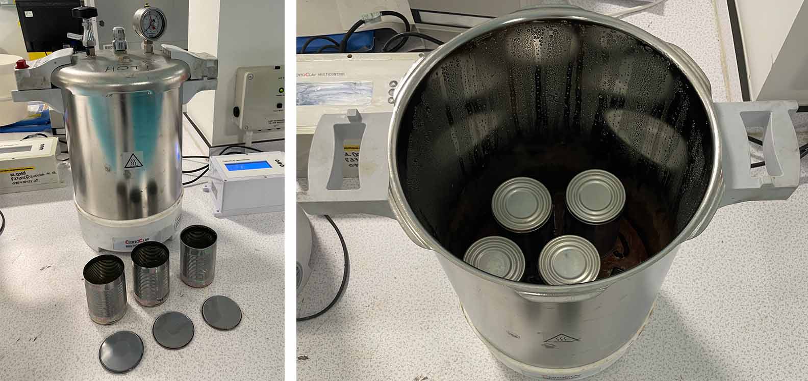 - We fill cans with food simulant solutions, then seam the lid on. We leave a small amount of headspace which creates a vacuum inside when the can is sealed