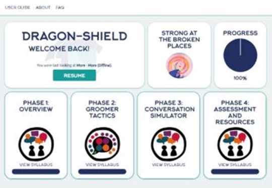 DRAGON-Shield is a multimedia, interactive platform that provides training on the ways groomers and children communicate with one another during online grooming conversations.