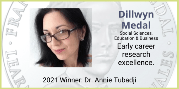Annie Tubadji, Assistant Professor and Senior Lecturer in Economics has received the Dillwyn Medal (Social Sciences, Education and Business) for her work on cultural bias, inequality, and discrimination.