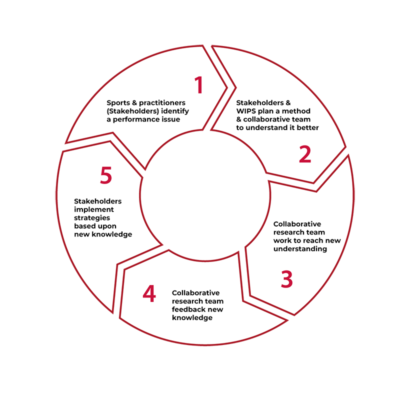 WIPS works alongside stakeholders (sports and practitioners) to identify performance questions and follow a cyclical process to feedback new knowledge, implement and review outcomes/strategies.