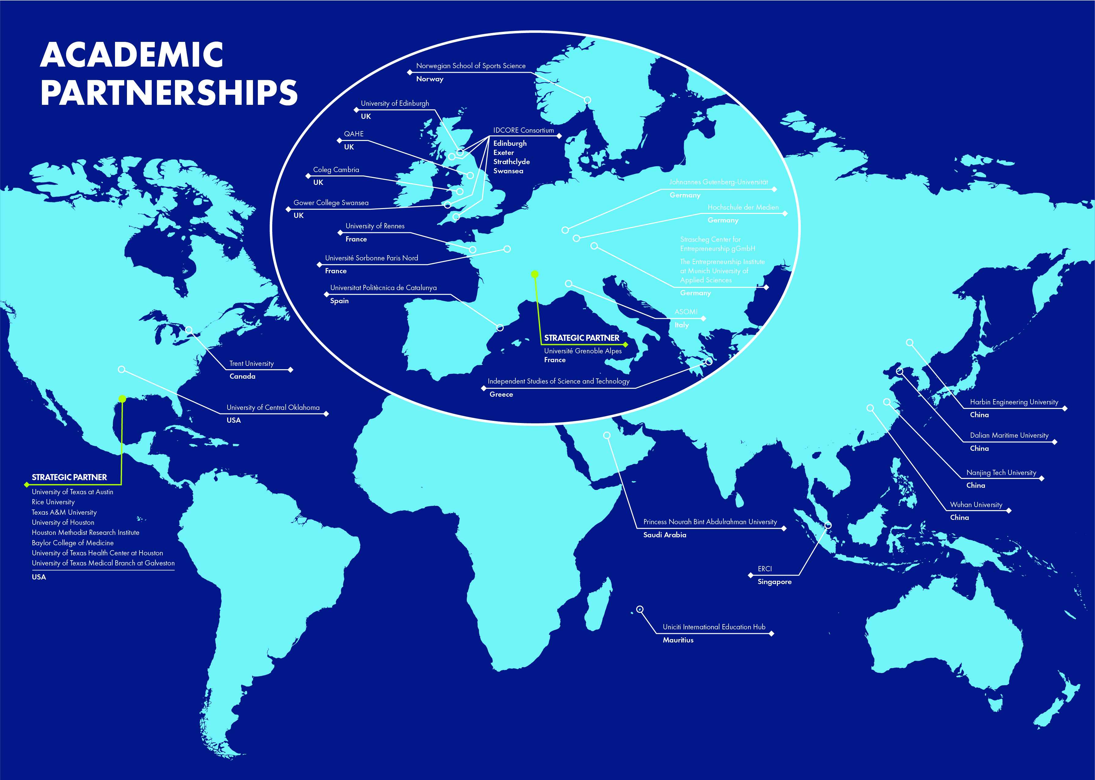 We bring together institutions and organisations from around the world to create and develop innovative international programmes, collaborations, and strategic partnerships with world-class universities. The international partnerships include those with Grenoble Alpes, University of Texas at Austin, Texas A&M University, Houston Methodist Research Institute, Paris Sorbonne, University of Cape Town, Aarhus University and Auckland University of Technology, to name a few. Click to see a full list of Swansea's partnerships.