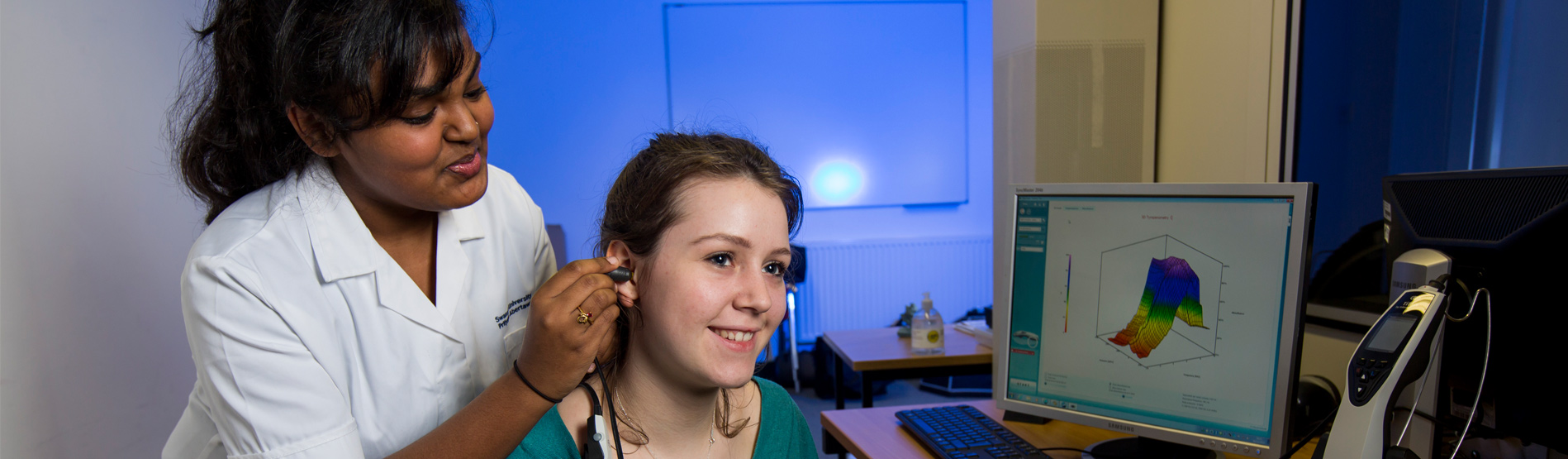 You will learn how to assess hearing capacity and the clinical nature of the course will provide the practical skills needed for employment in the profession. The work involves treating, monitoring and preventing disorders of the auditory system. A large part of this involves the assessment of hearing capacity of adult patients re-accessing the audiology service, followed by rehabilitation of impairment. This is largely achieved by fitting, verification and adjustment of hearing aids and then training patients on how to use the hearing aids effectively.